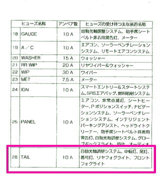 従いまして、ヒューズボックスは「NO,26のTAIL(10A)に決定です。