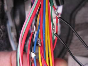 下手くそですが、ハンダ止めしました。 カッターナイフで被覆を削り中の線が少しでも見えれば、 後はハンダの熱で被覆は溶けてくっつきます。 分岐コネクタは配線を切断する恐れがあるため、使わないようにしています。 |