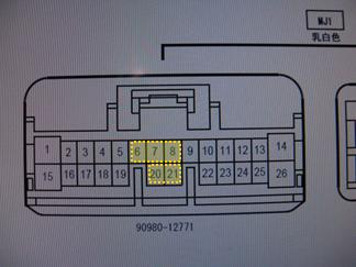 運転席側(ビルトインETCのあるパネル奥)スマートキーCPに刺さっているJ61カプラを見ると助手席用のスマートエントリー配線が空席状態(下図の赤番号)です。ちなみに黄色番号は運転席用のスマート配線です。これはもしかすると、ここに繋げばG仕様のスマート化が出来るかも知れないと淡い期待をしながら作業スタート。 J61カプラに簡易配線(被服を剥いてカプラに差し込む方法)し、助手席側まで5本の配線を這わして助手席足元(左カバー内)のMJ1カプラと繋ぎ(ここはハンダ止め)ました。 |
