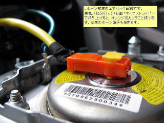 | ワイパーとウインカーSWの下にあるカバー蓋を外すと奥に太めの針金(クリップ)があり、両側ともドライバーで奥へ押込めばホーン部分が外れる。ホーン部分の裏は配線が繋がっているからムリに引張ったらダメよ。 | ホーン部裏のエアバッグ配線です。 黄色い部分(ロック)を細いマイナスドライバーで持ち上げると、オレンジ色カプラごと抜けます。 左奥のホーン端子も抜きます。 |