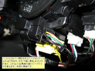 ハンドルとカバー類を外すとスパイラルケーブルが出てきます。その下側に黒色J47カプラがあり、このNO.1(白黒線の隣)にリペアワイヤを差込みます。手前の黒線です。 |