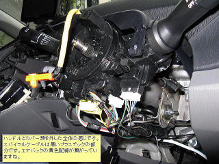 | ハンドルとカバー類を外した全体の感じです。 スパイラルケーブルは黒いプラスチックの部分 です。エアバッグの黄色い配線が繋がっていま すね。 |