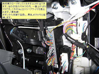 助手席グローブボックスを外すとCPが出てきます。左の灰色カプラ4つの内、一番上がJ5カプラです。これのNO.22にリペアワイヤを差込みます。(黄色線)ギボシから赤線で延長し、黒色J47カプラと結線します。 |