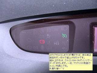 J5カプラ(NO.22)とJ47(1)が繋がれば、後は純正部品をポン付けで組み上げるだけです。 組み上がれば、クルコンSW-ONでインジケーターが点灯します。一応、プリウスの取説(クルコン)を読んでね。お疲れ様〜(^_^)v |