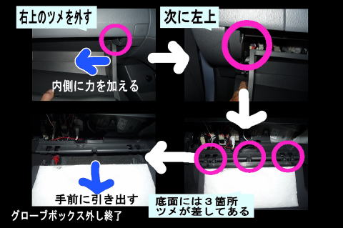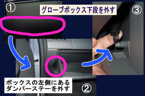 グローブボックス内を空っぽにして、左側側面にあるダンパーステーを指先で軽く外します。 (簡単に外れます) |