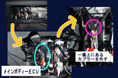 メインボディECU様のご登場です! 何故か邪魔するように斜めに配線の束がありました。私のプリだけか? 縦列の最上部にあるカプラーを外す。 |