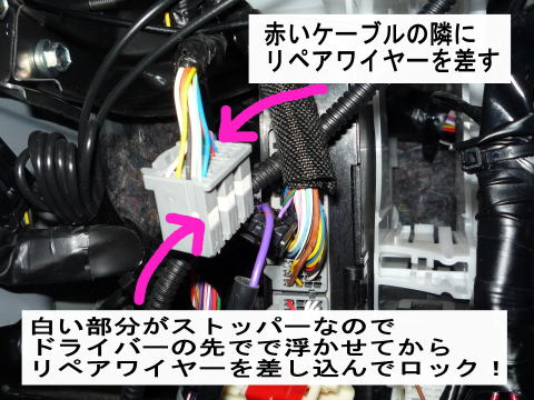 マイナス端子を外して行いましたよ。面倒ですが電装いじりの基本ですからね!